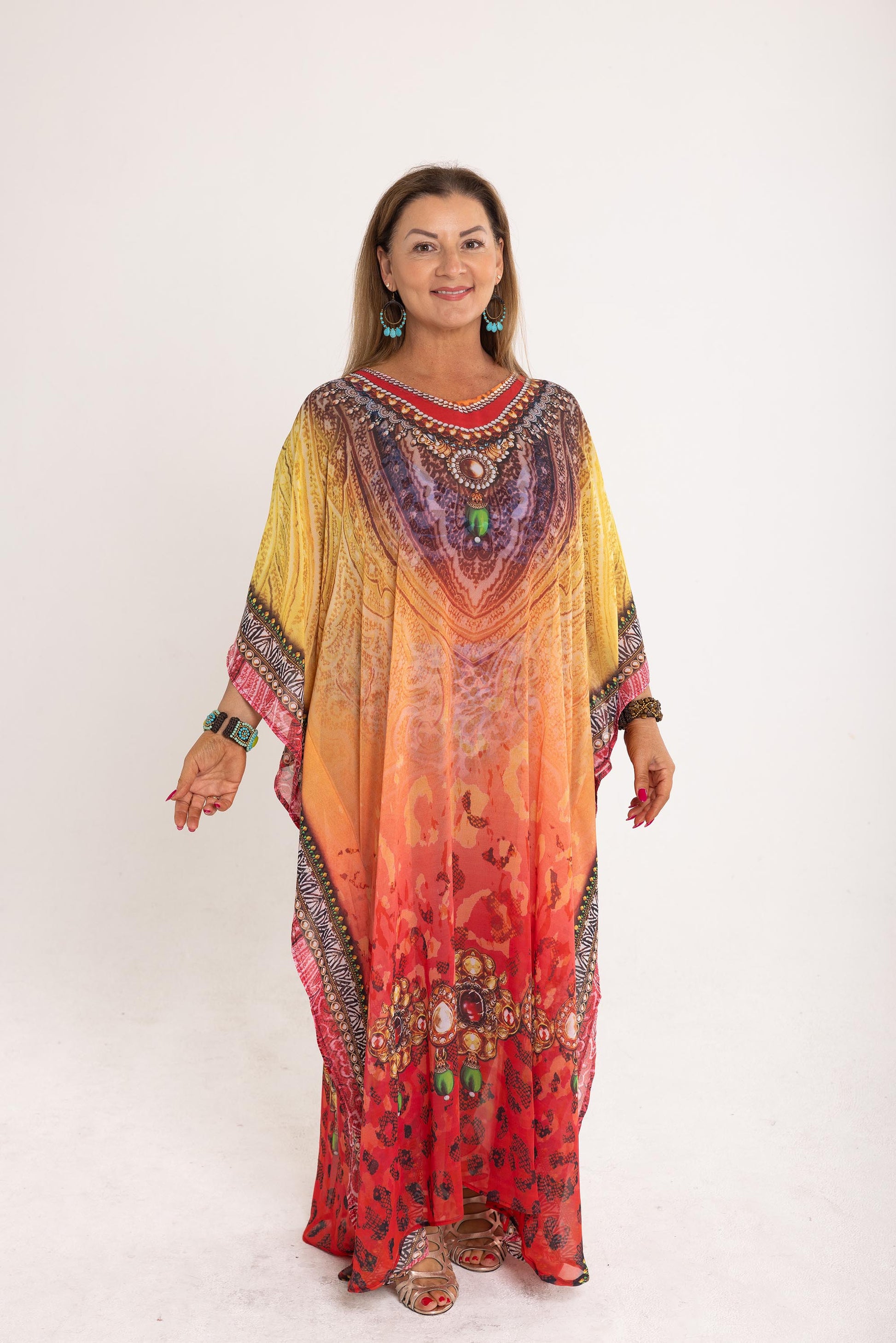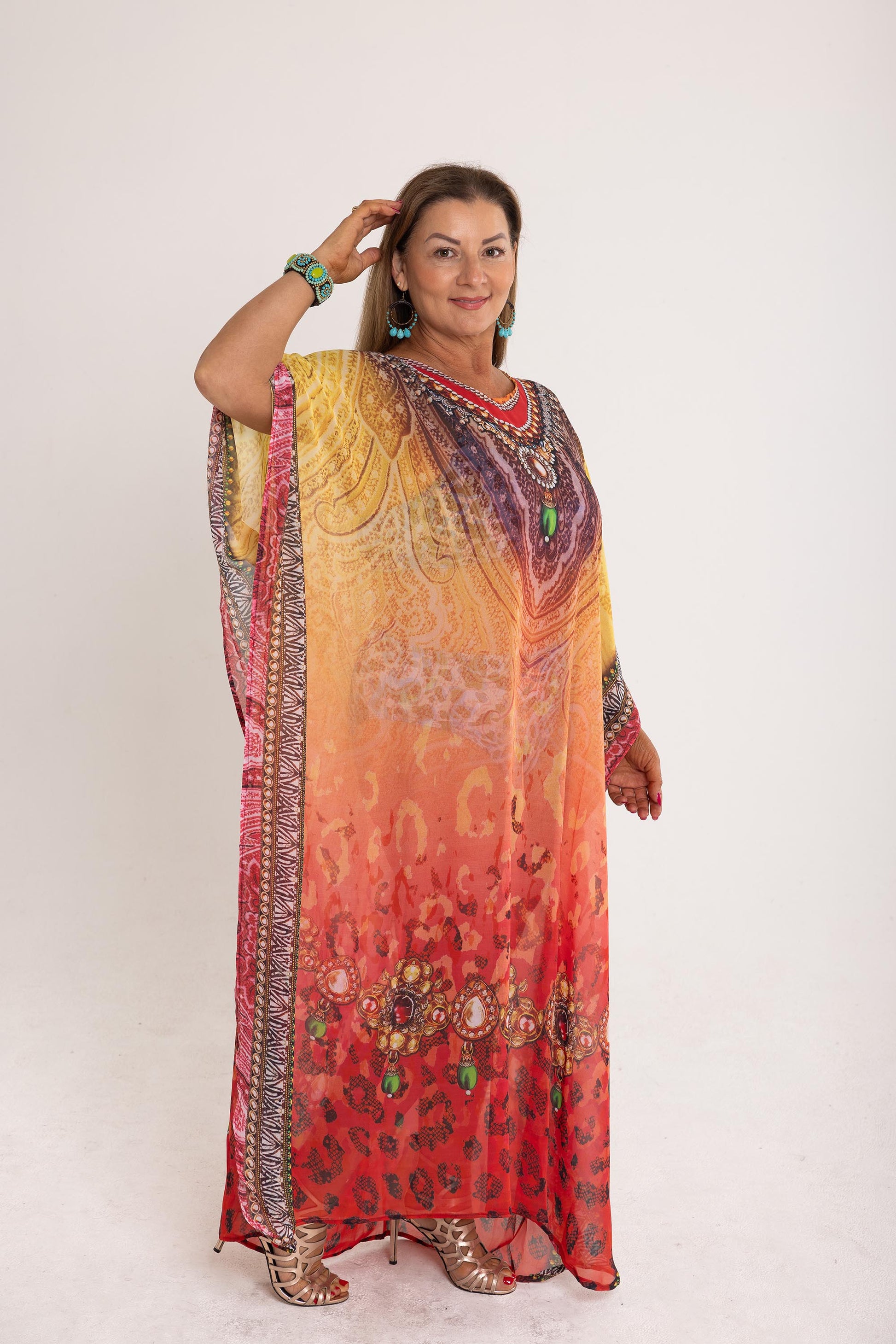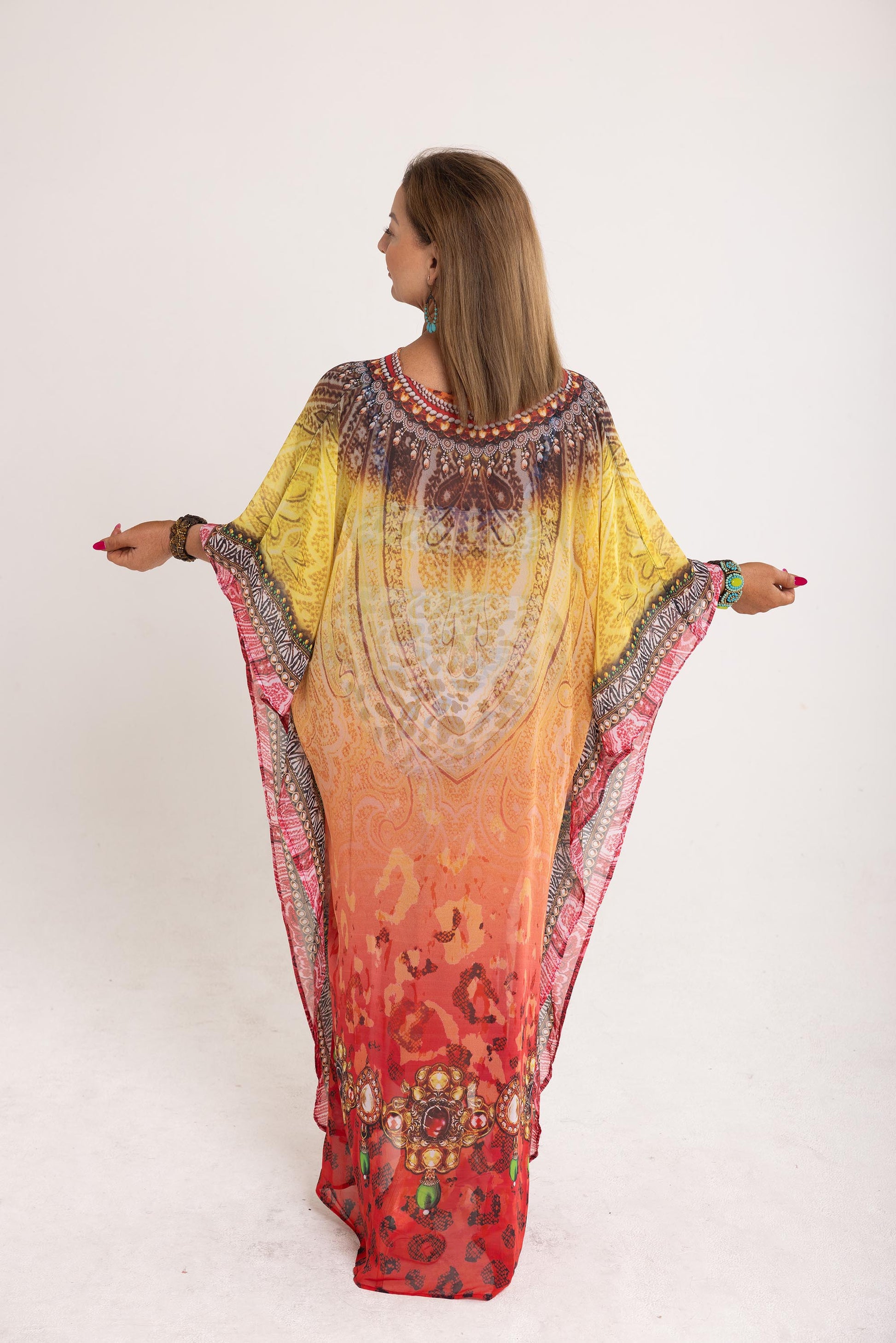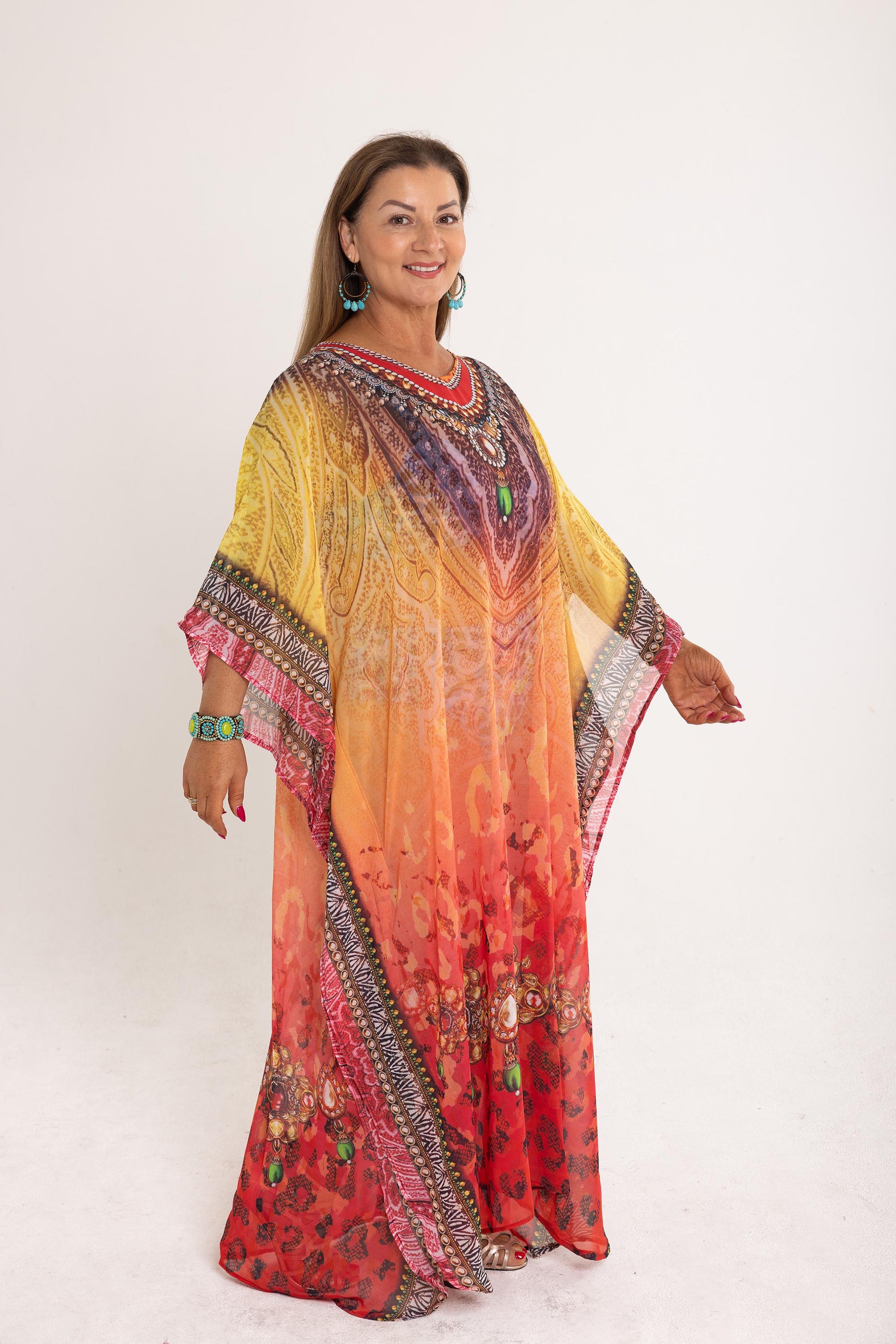 Look stunning in The Spanish Kaftan. Made from soft cotton Georgette Chiffon. It is sheer, long and light with a digital print chiffon fabric. Allowing air to pass through easily, featuring V-neck design, red and yellow hues and with printed pattern on the bottom.