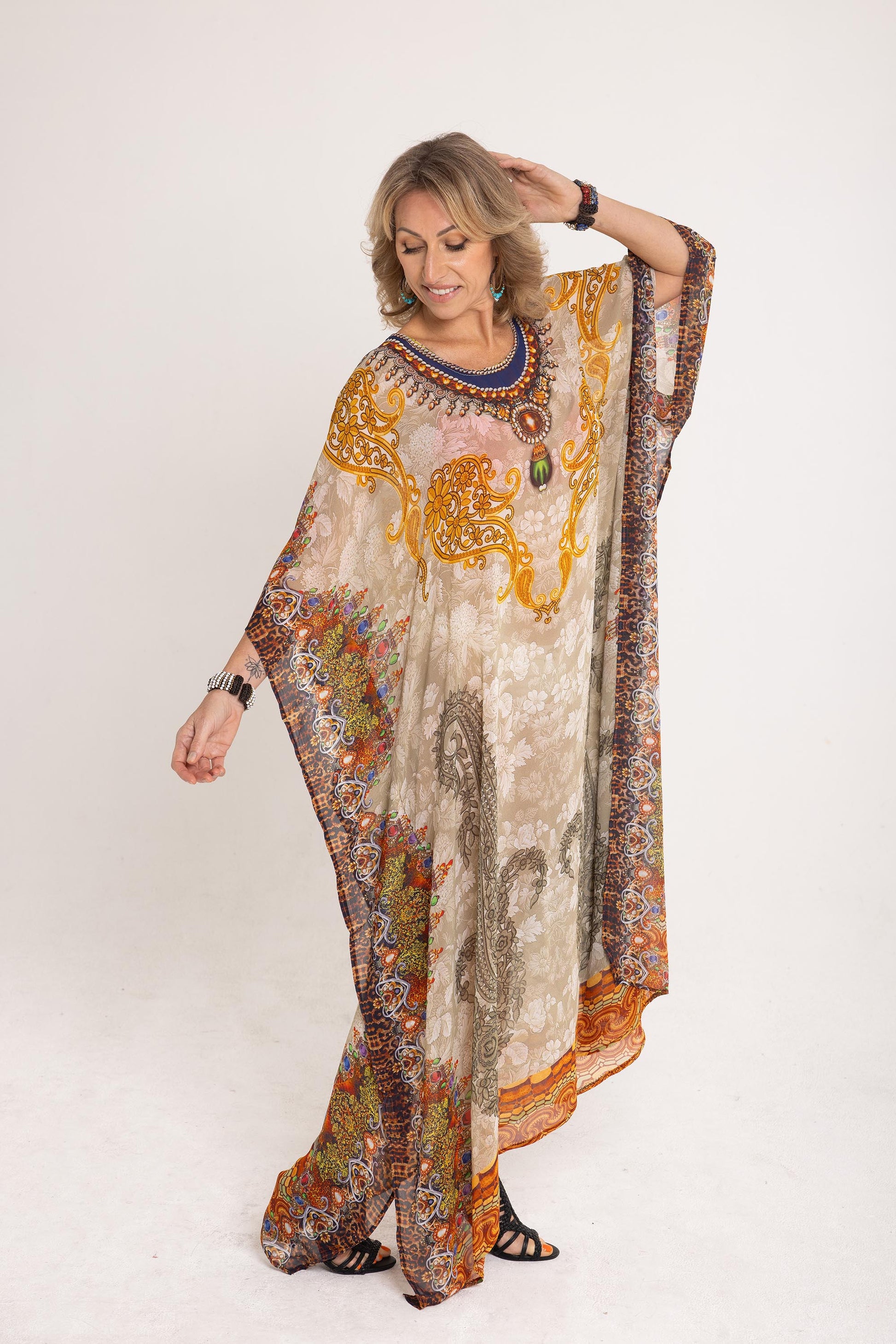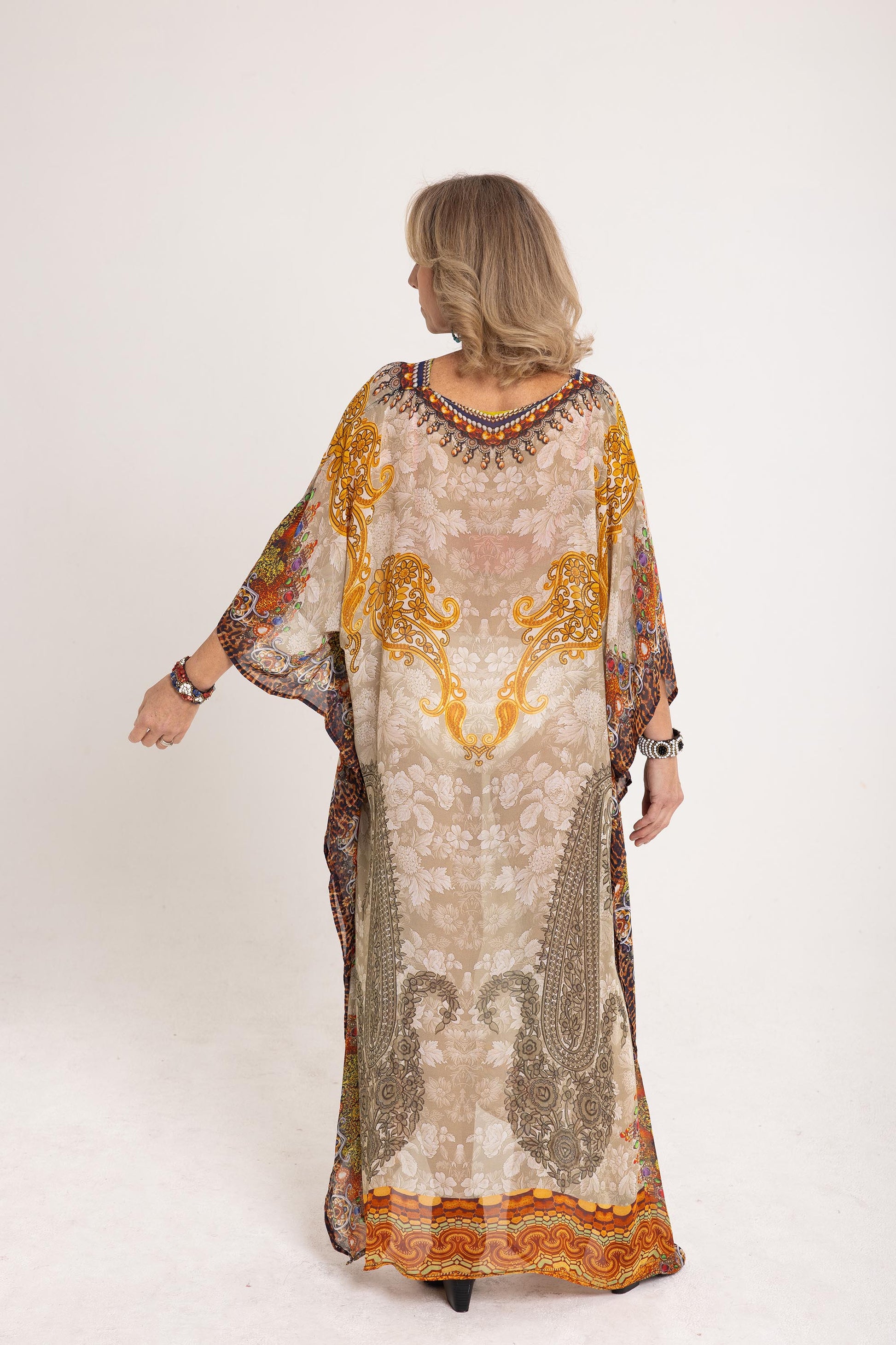 Look stunning in The Venice Kaftan. Made from soft cotton Georgette Chiffon. It is sheer, long and light with a digital print chiffon fabric. Allowing air to pass through easily, featuring circle neck design, beige hues, yellow and white pattern prints and animal print on the sides.