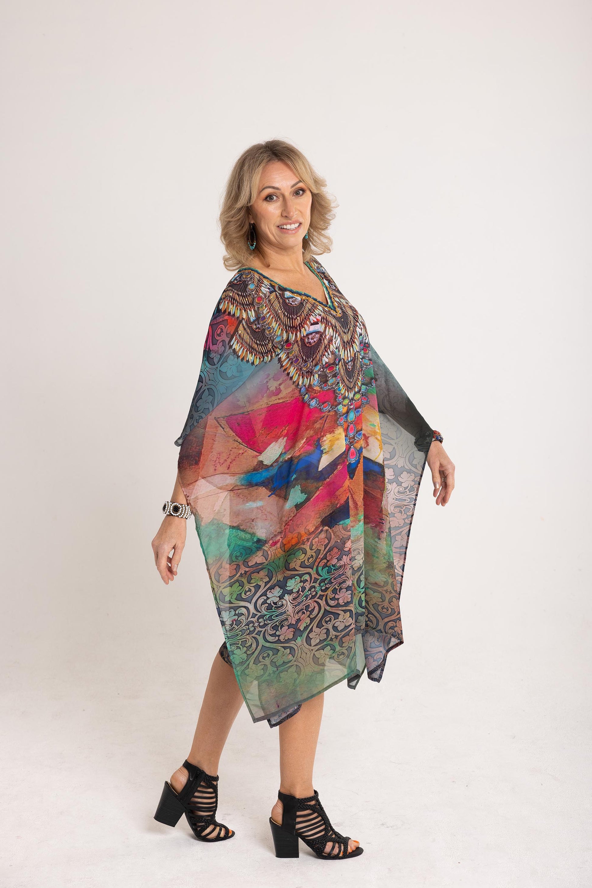 Look stunning in The Florence Kaftan. Designed with Crystal Embellishment around the V-neck. Made from soft cotton Georgette Chiffon. It is sheer and light with a digital print chiffon fabric. Allowing air to pass through easily, featuring colours of green, red and blue hues and flower print.